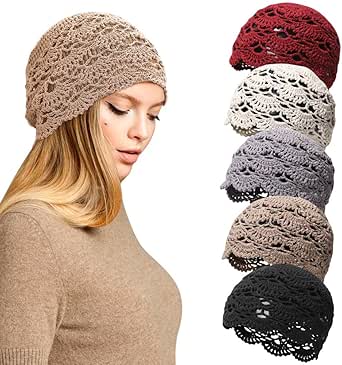 5Pcs Crochet Slouchy Beanie Hat Fall Handmade Knit Floral Skull Cap Lightweight Cotton Cutout Summer Hats for Women Girls